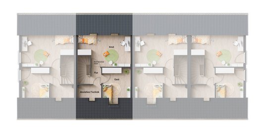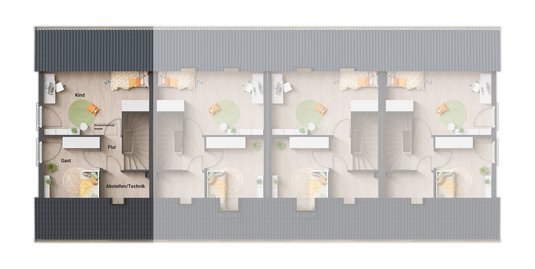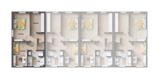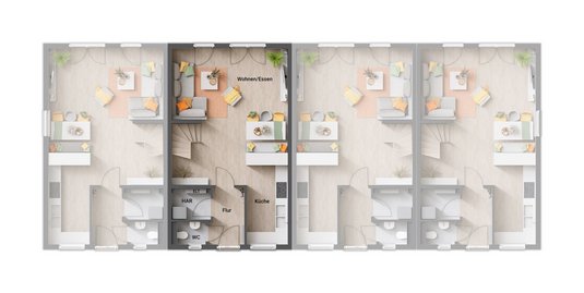 Das Reihenhaus Mainz 128 bietet Ihnen die ideale Kombination aus modernem Wohnen und effizienter Flächennutzung. Mit vier Wohneinheiten entsteht ein attraktives Zuhause, das zugleich Raum für Individualität und Gemeinschaft schafft. Jede Einheit verfügt über rund 140 Quadratmeter Wohnfläche, verteilt auf drei Etagen mit einem großzügigen Wohn- und Essbereich im Erdgeschoss, komfortablen Schlaf- und Kinderzimmern im Obergeschoss sowie einem vielseitig nutzbaren Studio im Dachgeschoss.