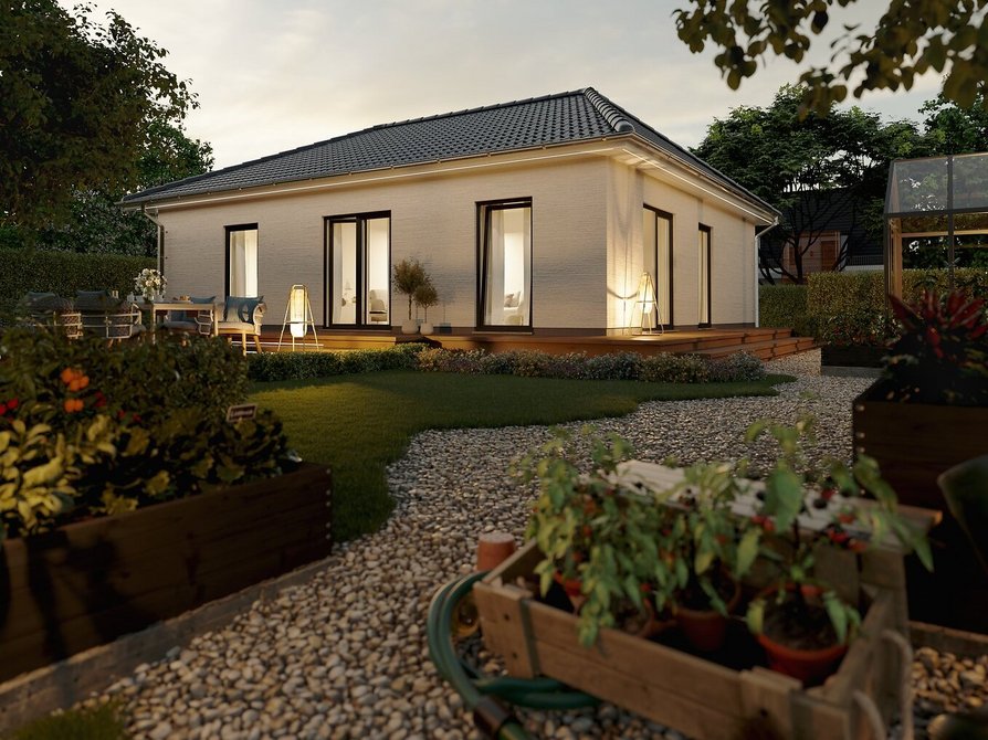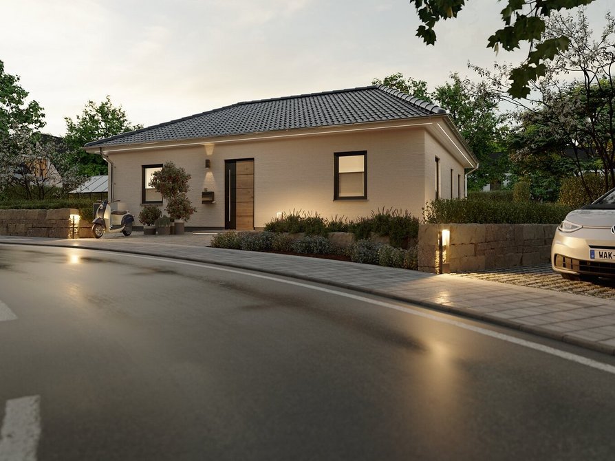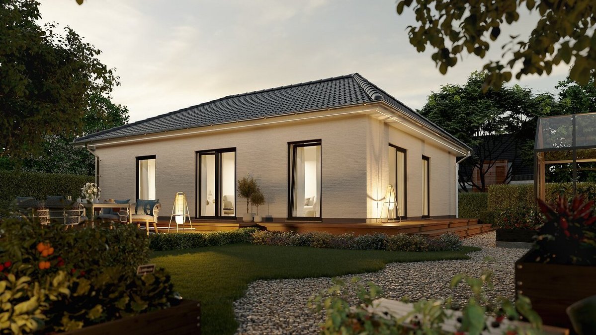 Der Bungalow 110 bietet auf einer Ebene viel Platz für die ganze Familie – mit hellem Wohnbereich, 3 Schlafzimmern und direktem Gartenzugang. Das Walmdach verleiht Charakter. Jetzt anfragen und stufenlos wohnen!