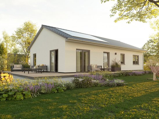 Der Bungalow 100 Novo – rund 100 m² Wohnkomfort, moderne Optik und clevere Highlights wie überdachte Terrasse, Gründach, Photovoltaik und Design-Extras. Jetzt anfragen und dein Traumhaus entdecken!