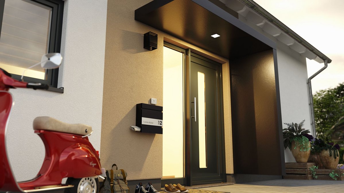 Wie bereits oben angedeutet, können Sie als Sonderausstattung kräftige Farbakzente mit Hellbezugswerten zwischen 11 und 20 setzen. Im Hauseingangsbereich können Sie sich für eine Ausführung mit Besenzug-Putz entscheiden (das Town & Country Haus Clever 138+ verfügt im gesamten Erdgeschoss über diesen Putz).